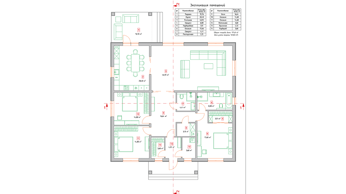 В доме располагаются необходимые бытовые помещения: котельная, гардеробная, 2 санузла, кухня-гостиная. Кухня-гостиная и терраса образуют просторное и уютное пространство, которое позволит комфортно разместить здесь большие компании гостей. Также расположены 2 гостевые спальни и одна мастер спальня со своим санузлом и гардеробной.